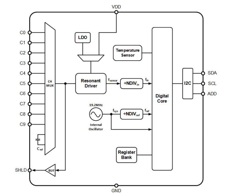上圖是MC1081的系統(tǒng)框圖,包括振蕩驅(qū)動電路(Resonant Driver)、多通道選擇器(Channel Mux)、分頻計數(shù)電路(Frequency Divider)、參考內(nèi)部時鐘(Internal Oscillator)、數(shù)字制邏輯(Digital Core)、寄存器堆(Register Bank)、溫度傳感(Temperature Sensor)、I2C接口、LDO及電源管理等功能模塊。MC1081的驅(qū)動電路和外部電容Csensor構(gòu)成電容傳感器,對應(yīng)產(chǎn)生不同的振蕩信號fsensor經(jīng)過分頻送至數(shù)字邏輯電路,測量并數(shù)字化信號頻率fin。數(shù)字邏輯使用參考頻率fref來測量傳感器的信號頻率fin,該參考頻率fref,通過芯片內(nèi)部的高精度19.2MHz時鐘經(jīng)過分頻器得到。通道C0~9,可以根據(jù)應(yīng)用需求,連接多路單點或者雙端電容電極,需要時可以通過SHLD進行有源屏蔽。I2C接口用于芯片的模式配置與傳感數(shù)據(jù)的讀取。