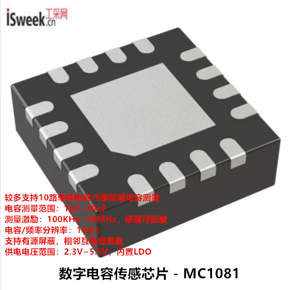 電容式傳感通過電場激勵下被測物質(zhì)的微小電容變化,可實現(xiàn)對不同物質(zhì)的介電檢測,是一種非接觸、高分辨率、高速度、低功耗、低成本的感知方法。和國內(nèi)外同類產(chǎn)品相比,MC1081芯片較多可同時測量10路單端電容,或者5路雙端電容。電容激勵頻率調(diào)節(jié)范圍大、幅度可配置,電容測量的工作模式多樣且配置靈活,工作電壓范圍寬,外圍電路簡單、適用性強。芯片可廣泛用于非接觸介電檢測、液位測量、觸摸控制、接近感知、水浸傳感、干濕度檢測、含水率分析等各種場景。